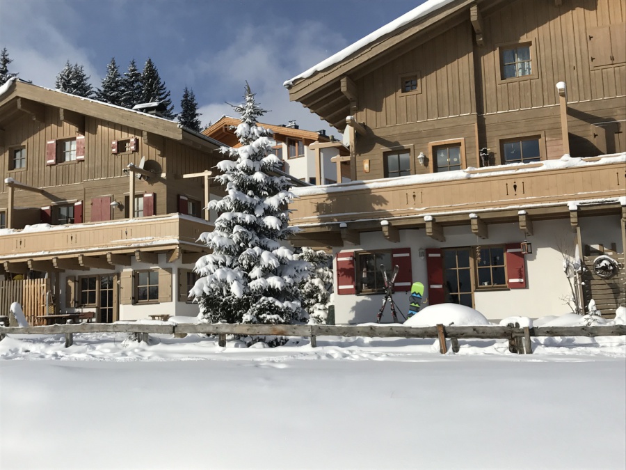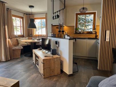 Wohn-Esszimmer, offene Küche, Bad mit Dusche und WC, Gäste- WC, Schlafzimmer mit Doppelbett, Schlafzimmer mit zwei Einzelbetten, Abstellraum mit elektrischem Ski-Schuh-Trockner, Parkplatz